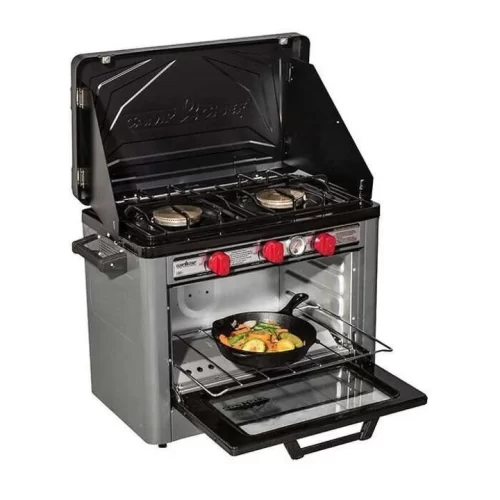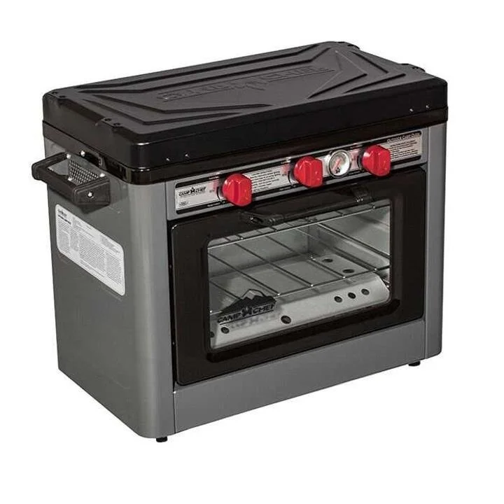 Bring along the Camp Chef Deluxe Outdoor Oven for endless cooking possibilities. This oven unlocks capabilities of a home oven and cook top. Designed to be both portable and versatile, the Deluxe Outdoor Oven provides you with enough heat to cook anything from a breakfast skillet to fresh cinnamon rolls. It*s perfect for camping, emergency preparedness, tailgating, and more. The oven can reach temperatures up to 400~F and will easily fit a 9∪ x 13∪ pan. With a 1-lb. propane bottle, the oven can hold a temperature of 350~F for up to 7 hours.